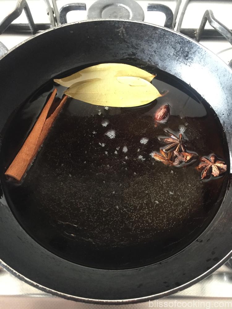 • In a saucepan, add oil, bay leaves, cinnamon stick, star anise and cardamom. Cook it on low heat for 10 minutes till the spices start to release the aroma. Now increase the heat till the oil just starts smoking. This will take 2 to 3 minutes.