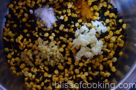• Wash the chana dal and set aside. Wash the Urad dal thoroughly and soak for 1 hour.