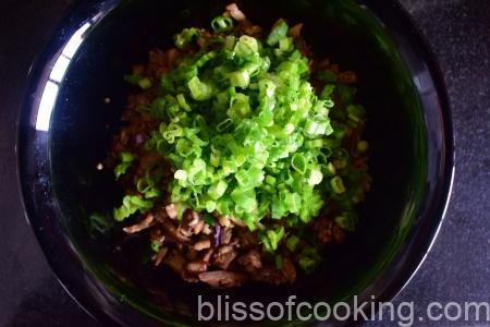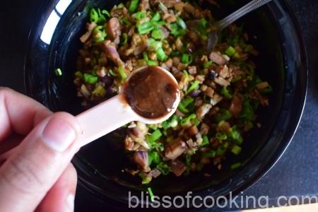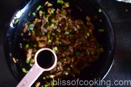 - Transfer in a bowl; add spring onions, black bean sauce, soya sauce, salt, pepper and mix it.