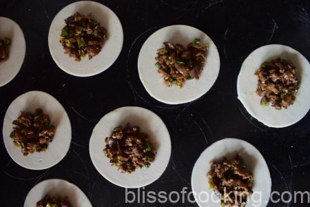 - Place 3/4 teaspoon of the filling onto the centre of the wrapper. Fold the wrapper over into a triangle shape, and then bring the two bottom corners together. Use a bit of water to “glue” the bottom corners together.