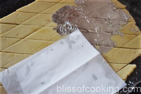- Cut the dough into diamond shape by first cutting the dough vertically and then horizontally.
