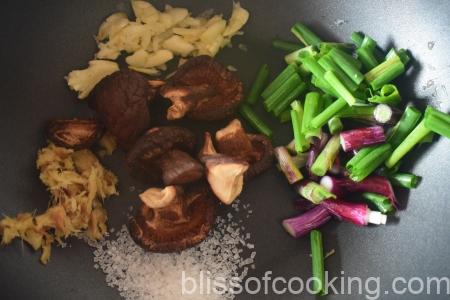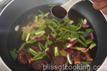 - In a pot add all the ingredients for the stock like dried shiitakes, ginger, garlic, spring onions, soy sauce, and sugar. Add 6 cups water and place over medium heat. Allow the liquid to reach a boil, and then reduce heat to low and let cook at a very slow simmer for about 30 minutes. Skim foam as necessary. Strain through a sieve. (Stock may be prepared up to 2 days in advance.)