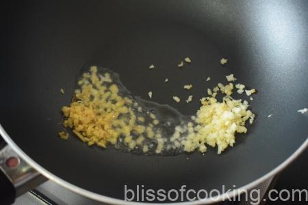 - Heat oil; add minced ginger, garlic and stir for few seconds.
