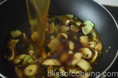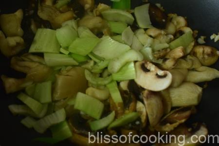 - Add the crunchy stem portion of the bokchoy, sliced shitake mushroom and stir for a minute.
