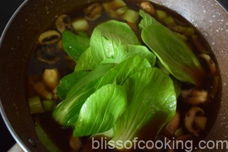 Now pour in the strained stock or the vegetable stock, light soy sauce, rice wine vinegar and the miso paste. Adjust salt to taste. - Once the soup comes to a boil, add the tender bokchoy leaves and let it boil for a minute or so.