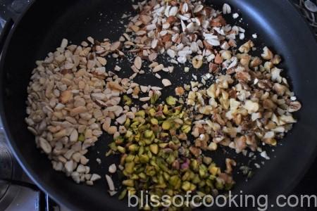 • Dry roast almond, cashew, pista and walnuts. Set aside.