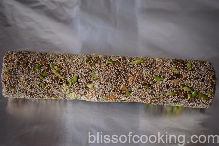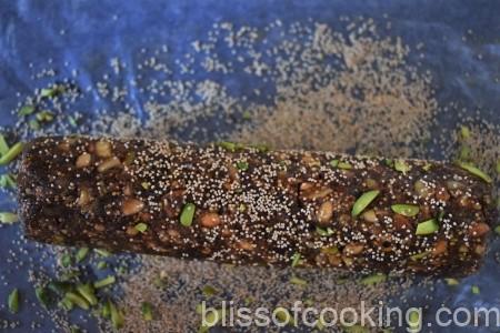 • Now spread half of the khuskhus and pista on the butter paper and roll the log to coat it evenly.