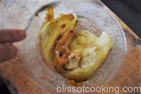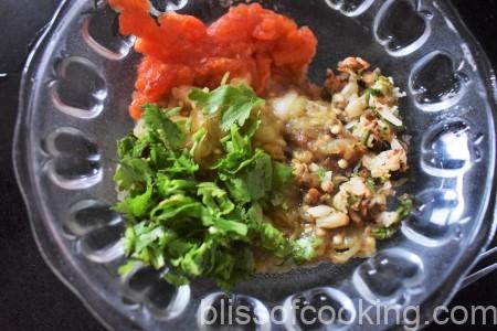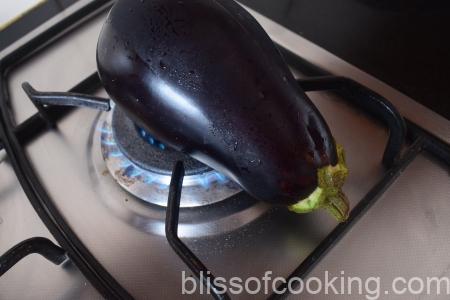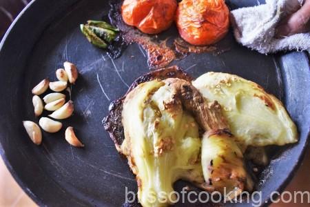 • On a baking tray, place the roasted aubergine, tomato, garlic pods and chilli and grill till the garlic turns brownish.