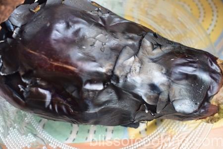 • Peel the skin from the cooled aubergine, trying to remove most of the skin, but don’t worry if a few flecks remain. Scoop out the flesh using a spoon.