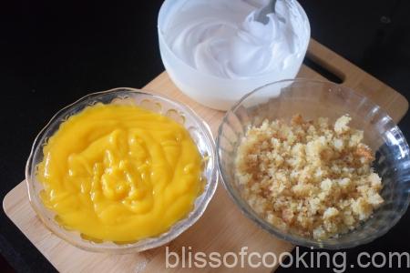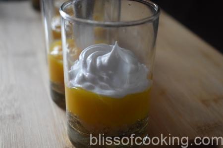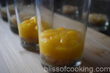 - Add a spoon of mango and lemon custard evenly on the cake layer in each glass.