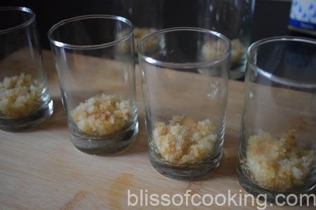 - Place a 2 teaspoon of the cake crumbs in each glass and press a little.