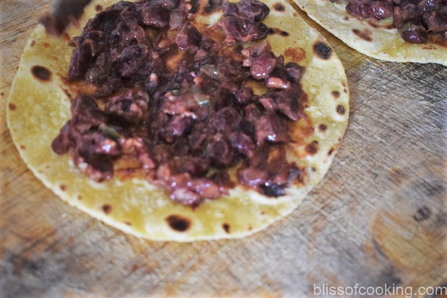 - First generously spread the fillings of refried beans, approx about a tablespoon.