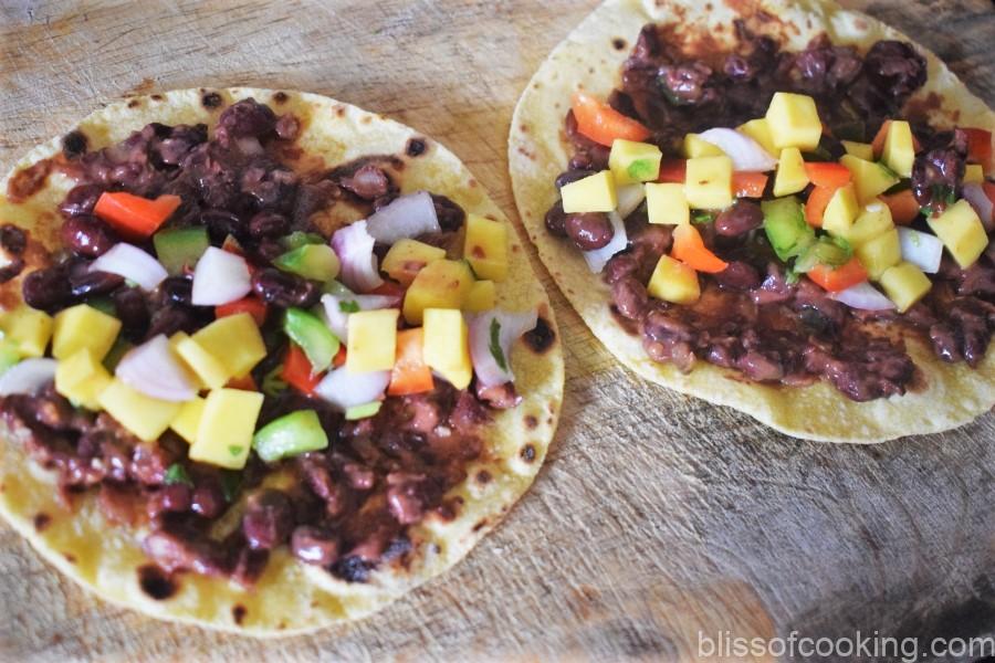 Black Beans and Mango Salsa Taco, is inspired by my fondness for mangoes and Mexican food. Being an Indian, Mexican food is very close to my heart and I find ways of making vegetarian dishes with these familiar ingredients. Mangoes are my weakness, whether ripe or unripe, I just love them. Black beans provide lots of soluble and insoluble fiber — both of which can decrease your risk of many chronic diseases and help you stay fuller, longer.