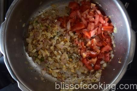 - Now add tomatoes, salt, turmeric, coriander and stir till the tomatoes start to soften.