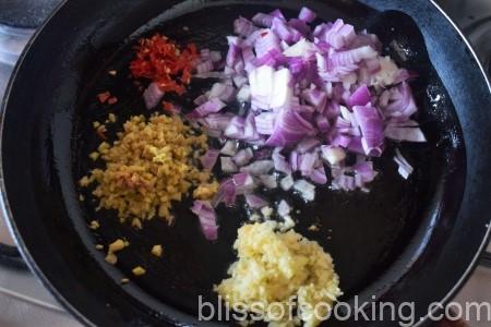 - Heat oil in a pan; add ginger, garlic, chillis, onions and stir for 2 minutes.