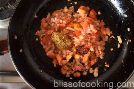 - Now add tomatoes, turmeric, chilli, coriander powder and saute.