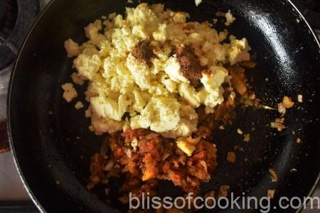 - Add paneer, garam masala, cumin powder, salt and saute for a minute till well combined.