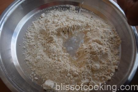 • Now add 1/2 cup of water and mix. Make a firm dough by adding more water if required. Cover and keep for 15 minutes.