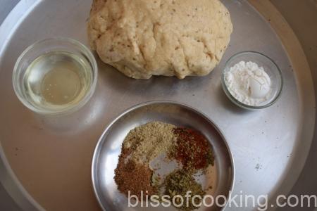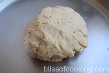 • In a large bowl place atta, maida, ajwain, salt and mix well.