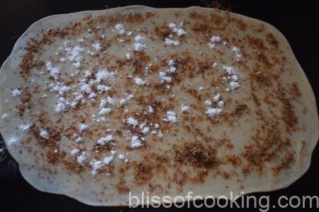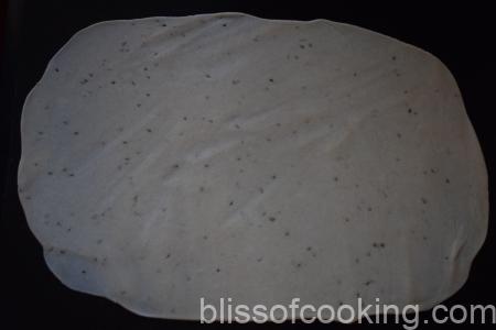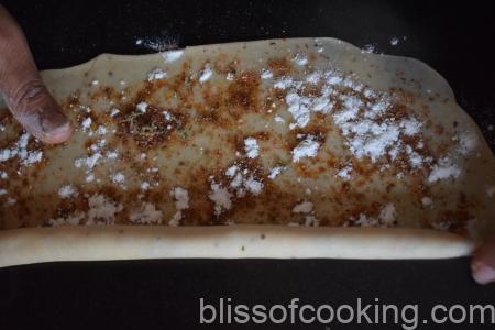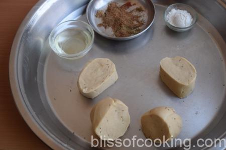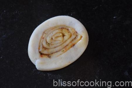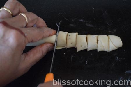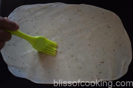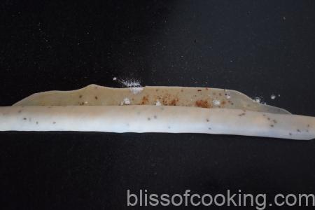 • Roll the disk into a long log like roll and seal the edges by applying little maida mixed with water.