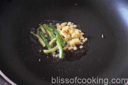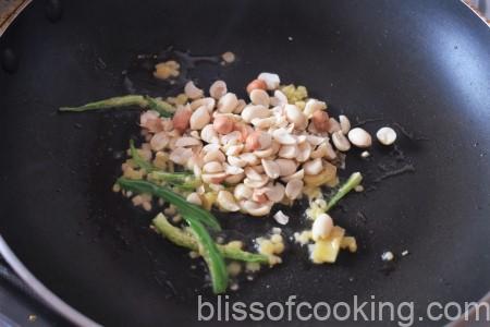 - Heat ghee in a pan, add green chillis, ginger, peanut and sauté for a minute.