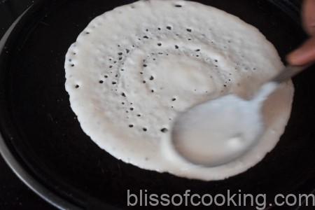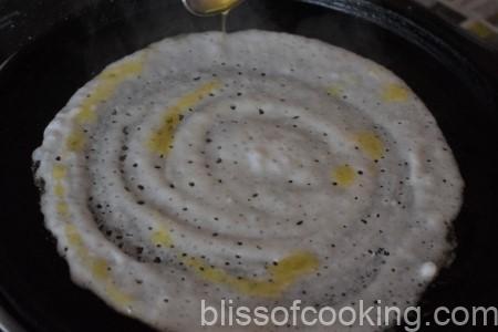 - Now pour a ladle full of the batter and working from the centre spread the batter in a circular motion with the back of the ladle to make a thin crepe. Drizzle a few drops of oil or ghee all around and a few drops in the centre. Let it cook till the bottom starts to turn golden.