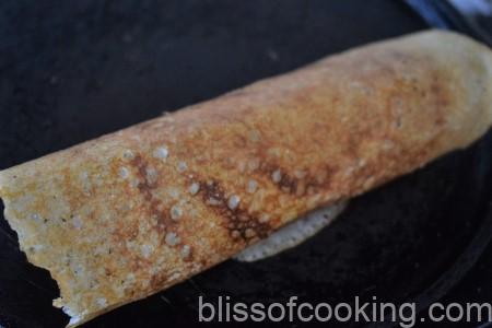 - Place 2 tablespoons of the filling in the centre and cook till golden brown and crisp. Gently release the dosa from the skillet and fold in the desired shape.
