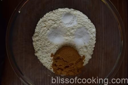 - In a large bowl; add plain flour, salt, baking powder, soda, cinnamon and mix.
