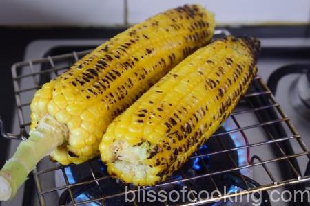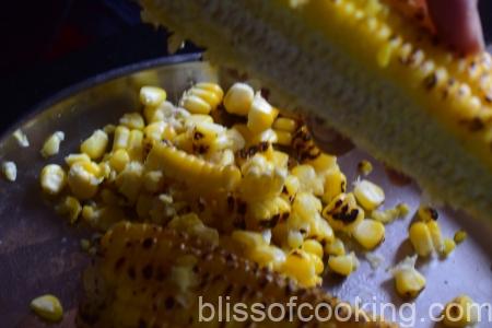- Roast the corn on flame and remove the kernels by knife. Make a coarse puree of half of the kernels and keep aside.
