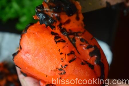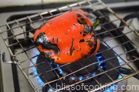 - Roast the red capsicum on flame and wrap it in a moist kitchen towel for 5 minutes. Now remove the charred skin. Now chop the peppers.