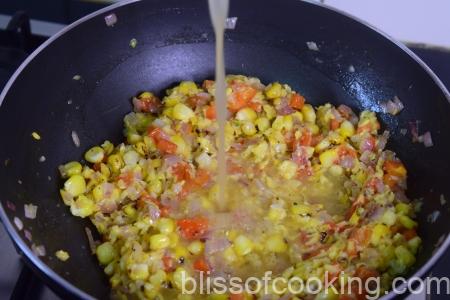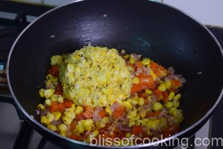 - Add the peppers and pureed corn. Now pour the vegetable stock. Let it boil till the potato is cooked.