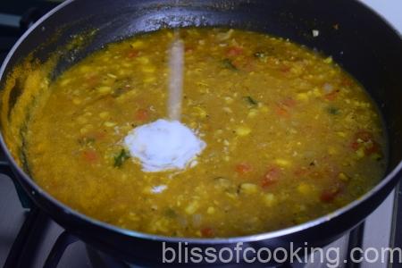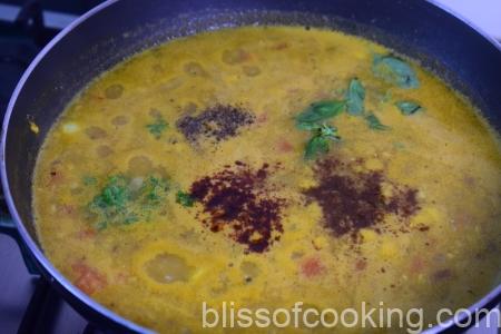 - Add coriander leaves and boil for two minutes. Switch off the heat.
