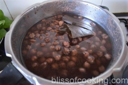 - In a pressure cooker transfer soaked chick peas, channa dal, salt, anardana, bay leaves, and water. Cook till tender.