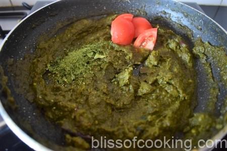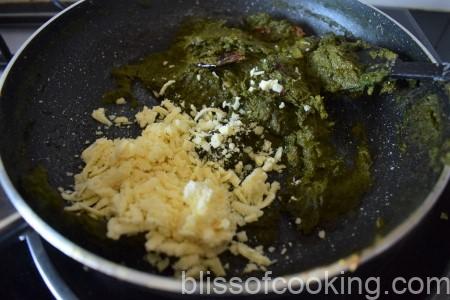 - Add spinach paste, saute for 2 to 3 minutes till well combined.