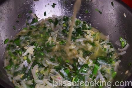 - Add spring onions/leek and sauté till the garlic changes colour.