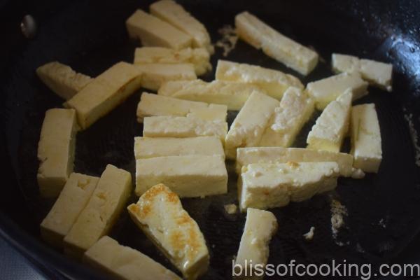 • Heat 1 spoon oil in a pan and add paneer. Pan-fry the paneer till its colour starts to change. Remove and keep it aside.