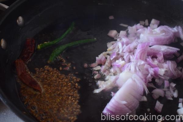 • Add chopped onion, ginger-garlic paste, green chilli and cook for 5 minutes or until the onion starts browning.