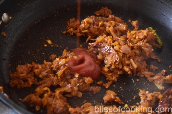 • Use of tomato ketchup gives thickness and body to the dish. It also adds a touch of sweetness to balance the spices.