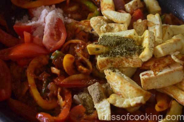 • Add tomatoes, kasuri methi, garam masala, salt, paneer and saute for 2 minutes. If using cream add now or add 2 to 3 tablespoon water and cook till the capsicums are just cooked but still have a little crunch left.