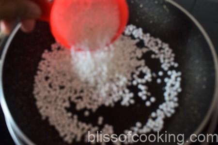 - Dry roast the sago on low heat for 5 minutes. Take care that it should not change colour. Grind to a powder and transfer to a bowl.