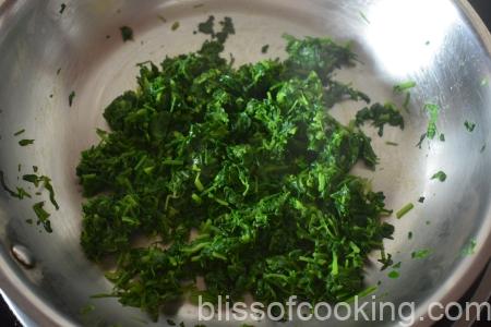 • In a broad pan add oil, methi and sauté on high heat to evaporate all the water from the methi. Set aside to cool.