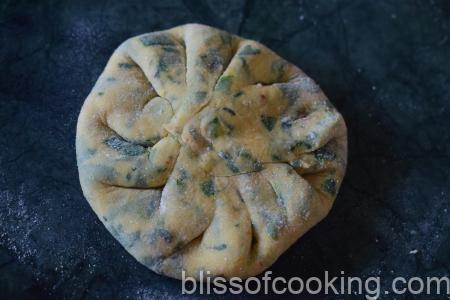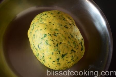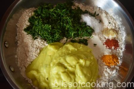 • In a bowl add atta, all the dry spices, salt, methi, curd and dal paste. Mix all and knead to make a dough. Add water if required to bind the flour so that a soft dough can be made. If the dough is too soft add a little atta and knead.