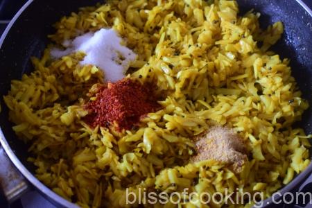 • Add  the turmeric, asafoetida powder and saute for a second.