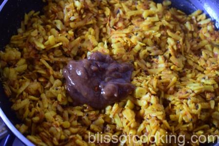 • Add tamarind paste, jaggery and let the mixture cook together for 5 minutes more on low flame to avoid burning.