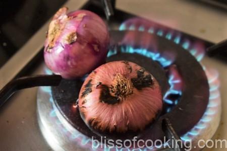 - Roast the onion on a gas flame till the outer skin is charred. Cool and peel and cut into four pieces.