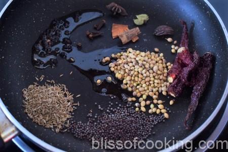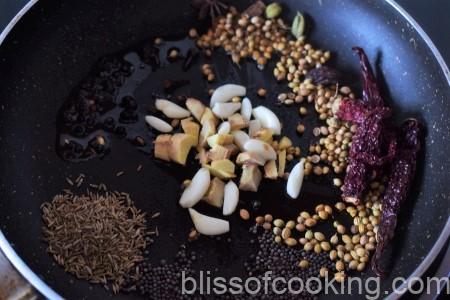 - Heat oil in a pan; add all the ingredients till Kashmiri red chilli’s (under masala paste / watan ingredients section.