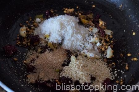 - Switch off the heat; add coconut, hing, stir and remove in a bowl. Let the masala mix to cool.