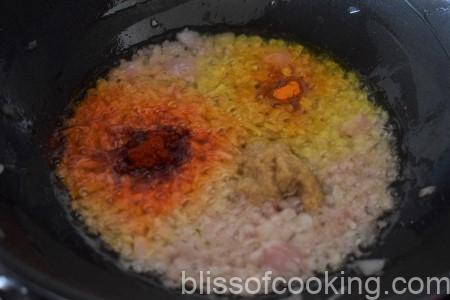 - Add ginger garlic paste, red chilli powder, and turmeric and sauté for a few seconds.