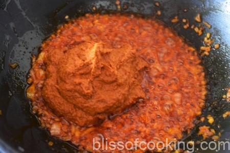 - Add the prepared paste, and salt and sauté till oil starts to leave on the sides.