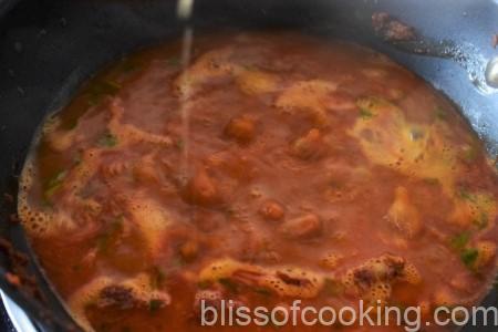 - Add 4 cups hot water and if you have water from the lentils. Boil on low heat for 15 to 20 minutes. Add tamarind paste if using. Adjust the seasoning.